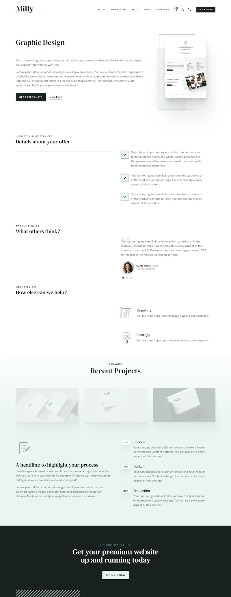 Meet Milly – a modern, minimalistic, and pixel-perfect child theme for Divi. Check out all the amazing layouts and features and get your website up and running with just a few clicks!